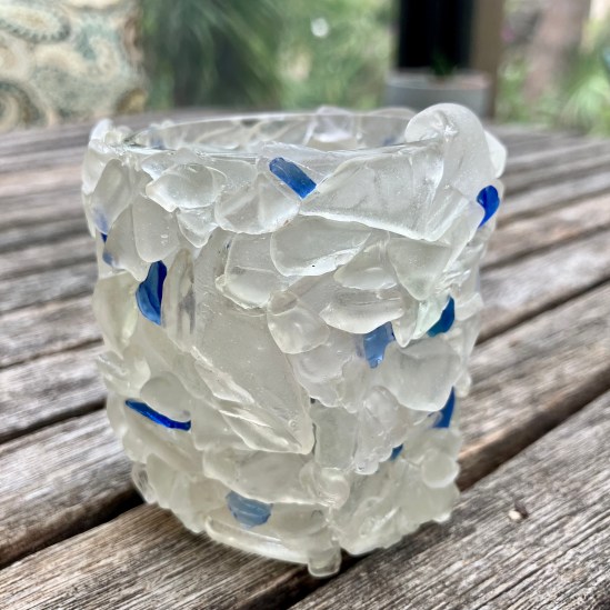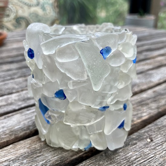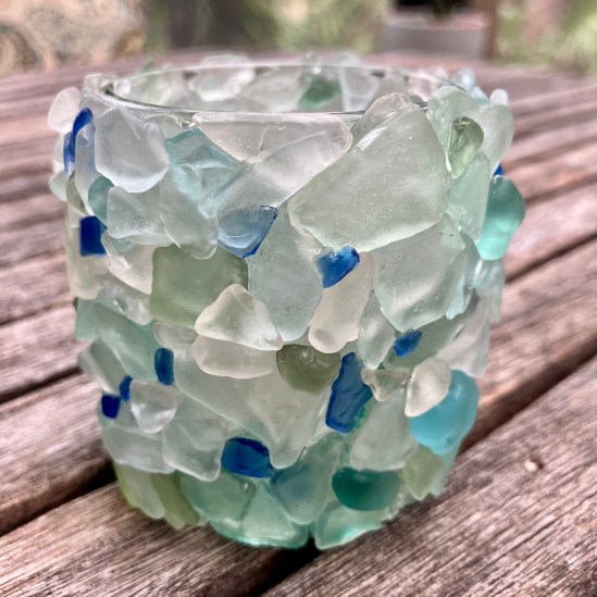 Votive candleholder covered in Gloucester, Mass., seaglass