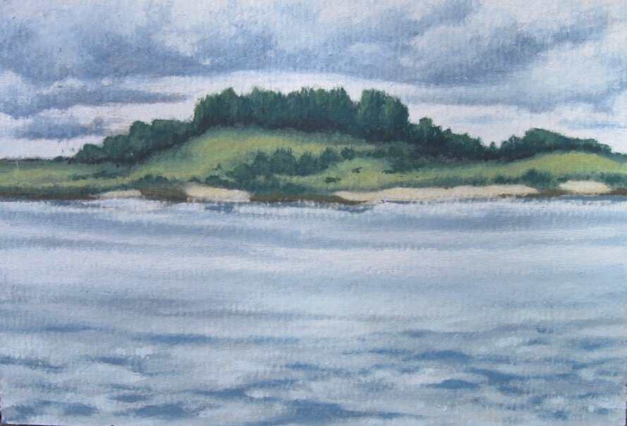 Castle Hill Published September 23, 2018 at 2329 × 1586 in Atmosphere View of Castle Hill, Ipswich, from Annisquam, Gloucester (oil on 4×6″ watercolor-paper postcard)