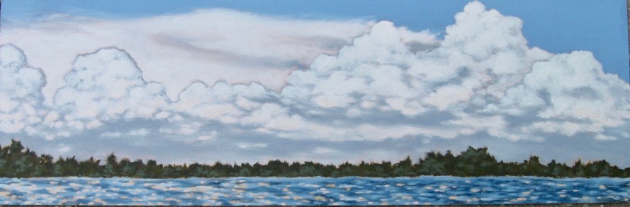 Palma Sola Evening Published March 1, 2024 at 1510 × 499 in Palma Sola Bay Eastern sky near sunset (oil on board, 16.5 x 5.5)