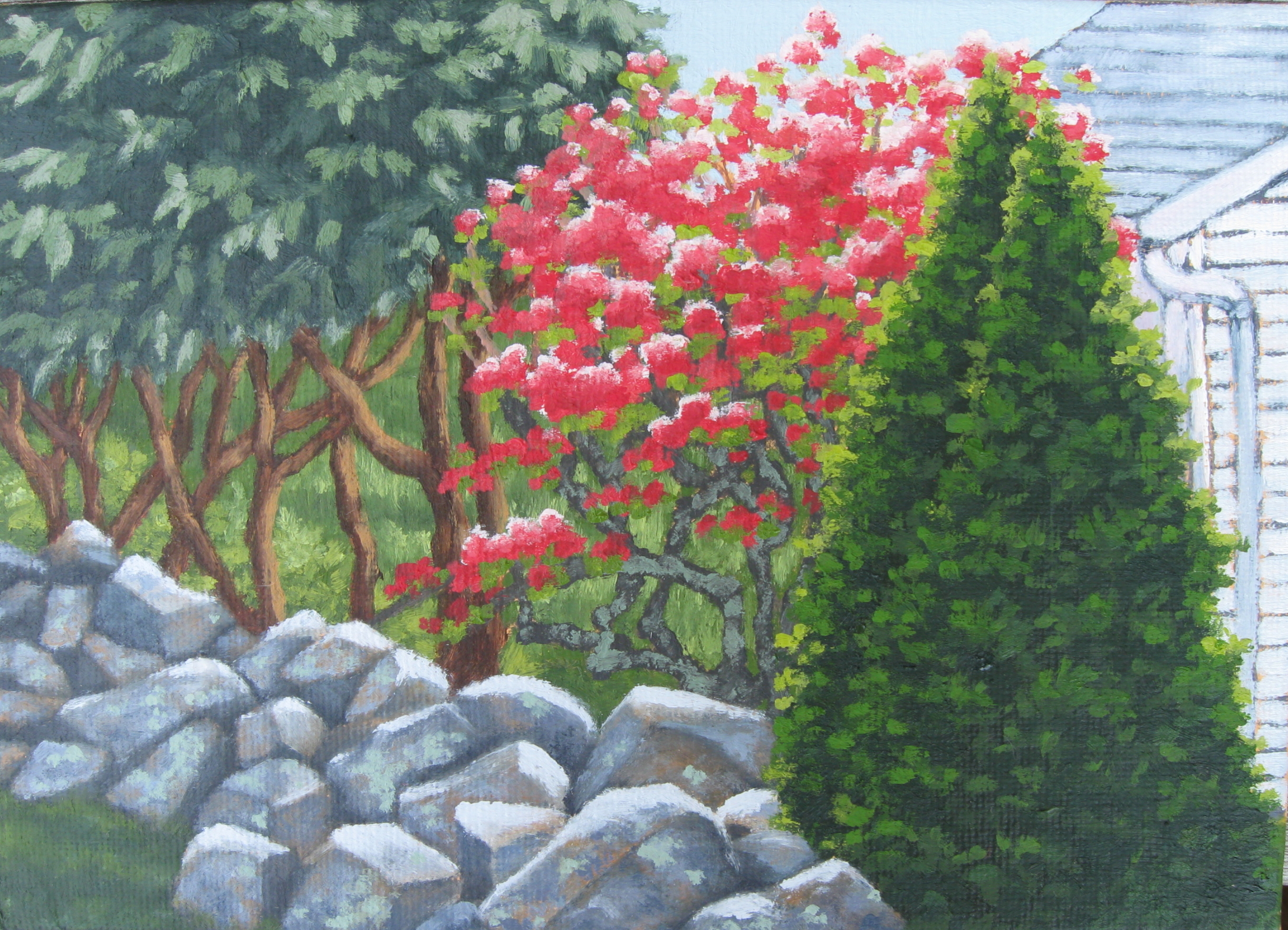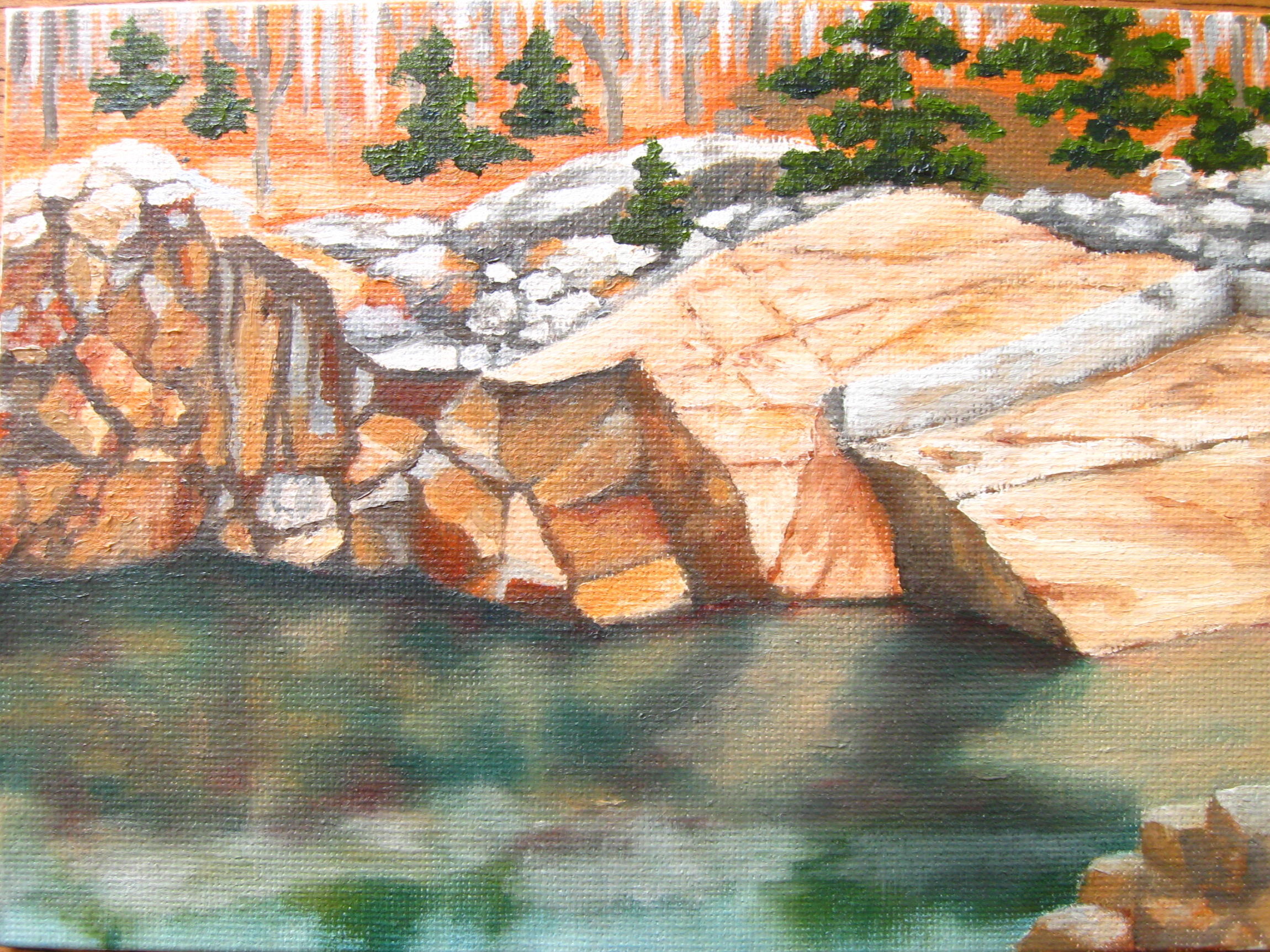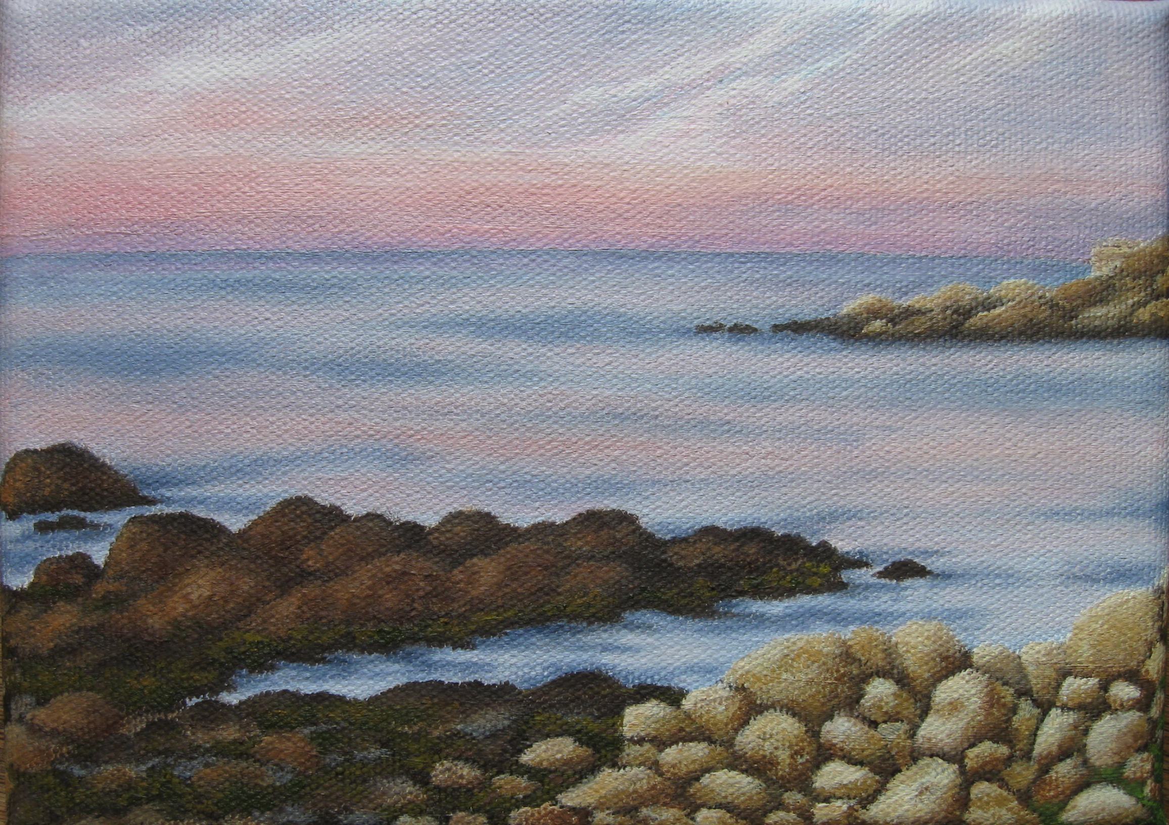 My favorite Cape Ann painter, Jeff Weaver of Gloucester, gave a demonstration at the Rockport Art Association last summer. One of the things he explained really well was the use of two major contrasting colors, warmer and cooler, and letting one dominate. Here’s an exercise in that, and in catching low winter sun. I liked when he said, “You can break every rule. All that matters is how it looks.” That consoles me when I realize how few of the rules I even know.